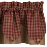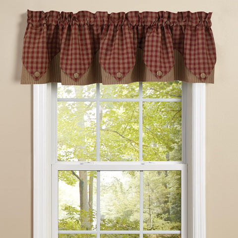 The Bridgeton Wine Layered Point Valance tastefully combines layers of burgundy and tan ticking stripes and burgundy and tan plaid check. Pointed edges with buttons create the perfect blend of farmhouse elegance and country charm. This vintage curtain is lined - 100% cotton.