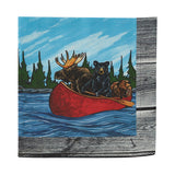 Bring the beauty of nature indoors with our Summer Vacation Cloth Napkins. It features a unique bear, moose and beaver wildlife in a canoe and stream evergreen setting. Crafted with sturdy cotton material, the Napkins are perfect for adding a little touch of nature to your dining table.