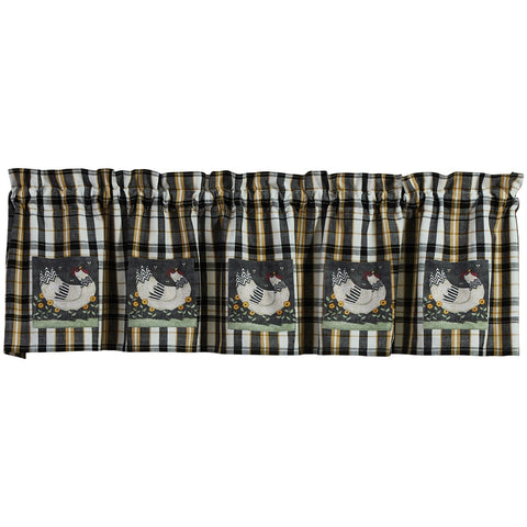 Add farmhouse flair to your room with Our Sussex Hen Valance.  It features appliqued Sussex white hens surrounded by yellow flowers and buzzing bees!