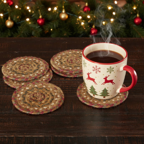 Our Cabin Patch Braided Coaster Set of 6 offers a rustic aesthetic of moss green, crimson, and creme in concentric braids of jute that blend together in the 4" base for a classic country look. Machine-stitching holds the braiding together even with increased wear and tear. Reverses to same as front.