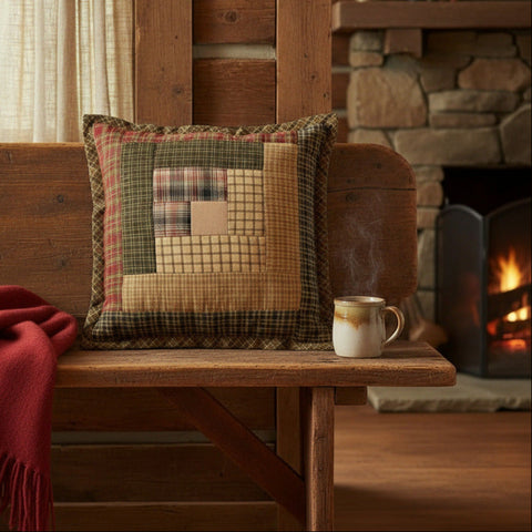 Add casual, rustic appeal to your lodge-themed abode with the Cabin Patchwork Pillow. Crafted in 100% cotton, showcasing a green and tan plaid trim with geometric squares, each with a different pattern for a unique, one-of-a-kind flair. Earthy tones of green, tan, and red add a cozy, warmth to your country style home. Toss this pillow on your favorite chair or add it to your bed for a decorative accent. Reverses to a matching plaid to complete the look.