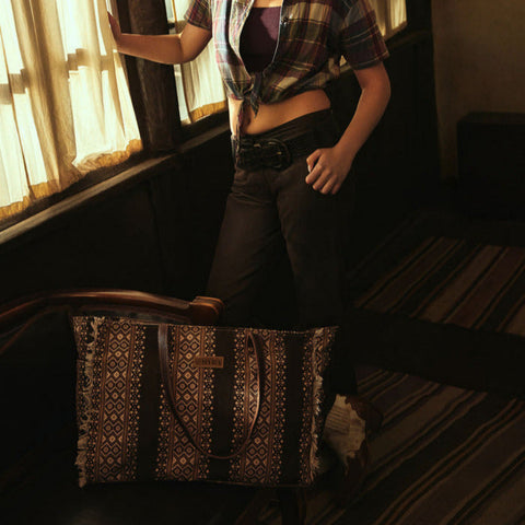 Bold geometric patterns meet sustainable style in our upcycled canvas weekender. Striking black and cream Aztec-inspired diamonds create a dramatic statement, while distressed edges add vintage charm. Finished with sleek leather handles and brass accents, this eco-conscious carryall elevates any weekend escape.