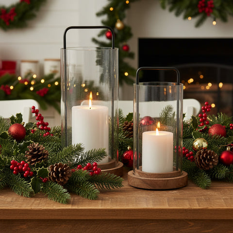 Bring farmhouse charm to your table centerpiece with our Wood & Iron Mason Lanterns. Available in 2 sizes. Black metal and glass with wood base. White candles not included.