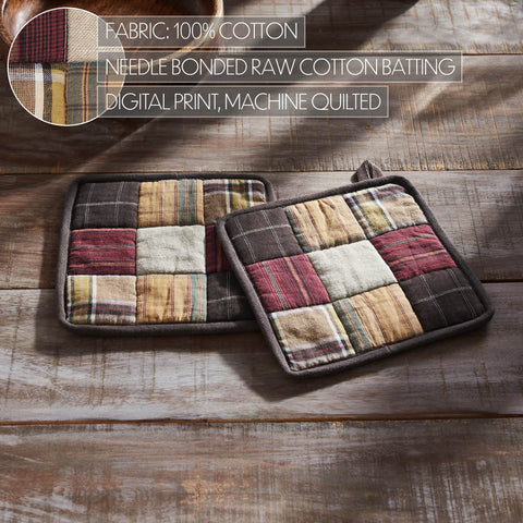 Enhance your rustic kitchen with the Cotton Pot Holder Set of 2, a charming addition to your primitive culinary space. Crafted with meticulous attention to detail, this set of 2 square 8x8-inch pot holders embodies the essence of patchwork charm, featuring deep Crimson and earthy tones from the Wattsyn Collection. These pot holders are not only stylish but also heat-resistant, providing you with the perfect combination of form and function for your cooking needs. The flat weave design adds a touch of primitive rustic appeal to your kitchen, making it an ideal choice for those who appreciate the warmth and character of country-inspired accents. The set comes in a rich Crimson color, seamlessly blending with your decor and adding a timeless rustic touch to your culinary environment. Whether you're preparing a home-cooked meal or simply adding accents to your kitchen, the Cotton Pot Holder Set of 2 is a welcoming addition that beautifully reflects the cozy and inviting atmosphere of rustic and primitive-style living.