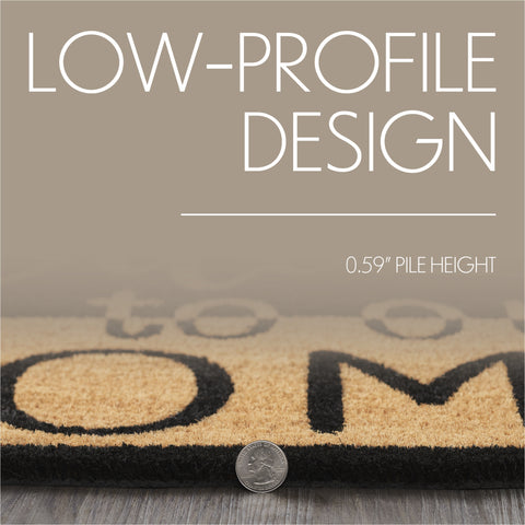 Welcome guests with rustic charm using the Welcome To Our Home Black Tan Coir Welcome Rug. This stylish doormat features the warm message Welcome to our Home in stenciled text, set against a striking contrast of deep black on the upper portion and natural tan on the lower portion. The design adds a unique and inviting touch, making it perfect for any entryway or porch with a rustic or country homestead vibe. Made from durable coir, this rug is designed to trap dirt and debris while adding a welcoming aesthetic to your home. Its non-slip PVC backing ensures the rug stays securely in place, offering both safety and stability, especially in high-traffic areas. The bold contrast of colors and simple yet inviting text make it an excellent addition to any farmhouse or primitive-style decor, creating a warm and inviting atmosphere for visitors.Â
