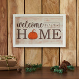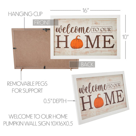 - Made from durable MDF material, this rectangular wall sign measuring 10x16 inches features the welcoming message "Welcome to Our Home" with a charming pumpkin incorporated into the word "Home" adding a delightful touch to your fall decor.