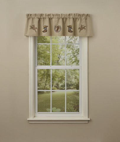 Our Western Valance tastefully combines various colors with embroidered and appliqued western themed images. It's the perfect blend of farmhouse elegance and country charm. Lined with 100% white cotton.