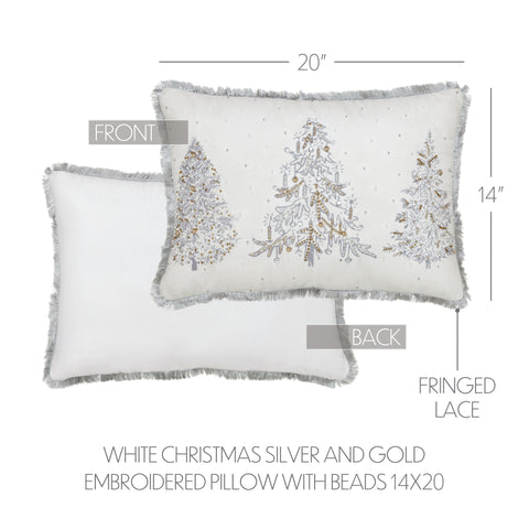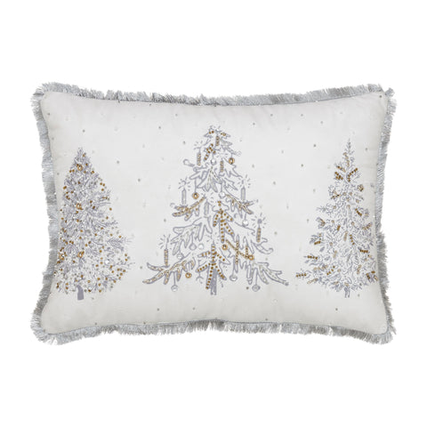 Add a touch of festive elegance to your home with the Christmas Embroidered Pillow with Beads. Designed for holiday charm, this 14x20 rectangular pillow features three beautifully printed Christmas trees in shimmering silver and gold. Each tree is delicately adorned with beaded accents, and tiny beads are scattered throughout the bright white background to create a subtle sparkle that catches the light. Crafted from soft polyester and finished with a refined silver fringe trim, this decorative pillow blends primitive rustic style with a hint of holiday glamour. The embroidered details and textured embellishments make it a standout accent in any Christmas decor arrangement.