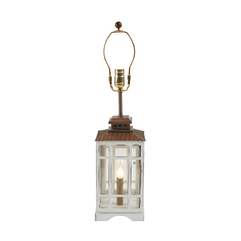 The Dorset White Lantern Lamp without Shade is an ideal accent piece in your farmhouse country home.  Hand crafted with a unique style and charm reminiscent of an original lantern. Features a hinged glass door, charming vented top.  Includes a 3 way switch featuring a night light.
