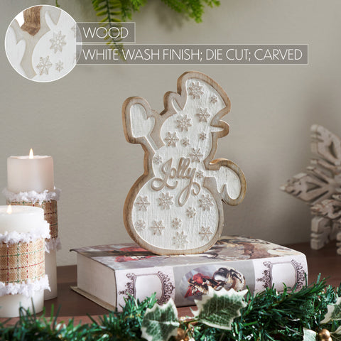 • Cookie Cutout Snowman Design: Features a charming cookie cutout snowman figurine with relief cut snowflakes and "Jolly" across the middle, adding a playful and rustic touch to your holiday decor.
