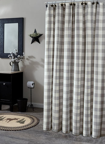 Decorate your farmhouse bathroom with the perfect blend of simplicity and country charm. The Buffalo Grey Check Shower Curtain 72x72 features large scale dove grey and antique white checks to give it that vintage, farmhouse touch. Includes button holes for shower hooks.