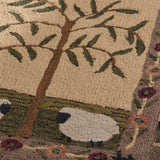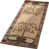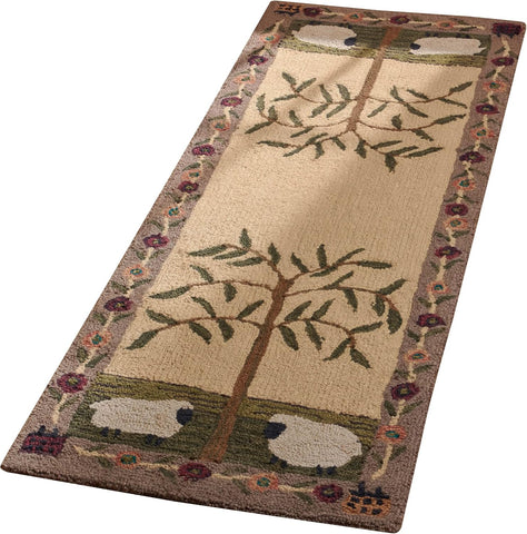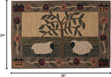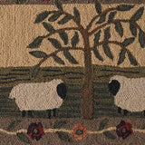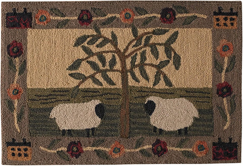 Add primitive country comfort to your home with our Willowton Hooked Rug. Handcrafted the rugs feature sheep under a willow tree bordered with floral vine and colonial style homes in the corner.