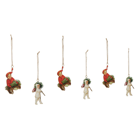 Celebrate the joy of childhood and the magic of the holidays with the Winter Fun Metal Ornaments Set of 6. Made from sturdy iron, this vintage-style ornament set includes two charming designs-one featuring a child in a creme snowsuit carrying a Christmas tree, and the other showing a child in red enjoying a sleigh ride. Each ornament is printed with nostalgic artwork and finished with a rustic twine hanger for a handcrafted look. With three of each design included, these ornaments bring a balanced and coordinated look to your Christmas tree, garlands, or seasonal displays. The festive color palette of Christmas red, creme, and evergreen evokes the warmth and wonder of a traditional holiday season. Their lightweight yet durable construction makes them easy to hang throughout your home year after year. Perfect for the bathroom, bedroom, dining room, entryway, kitchen, or living room, the Winter Fun ornament set adds a whimsical and heartwarming touch to any space. Whether displayed together or spread across multiple rooms, these ornaments capture the spirit of winter play and childhood memories. To maintain their vibrant look, simply wipe clean with a soft cloth.