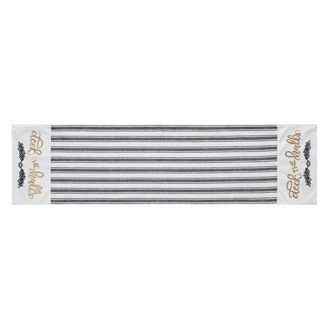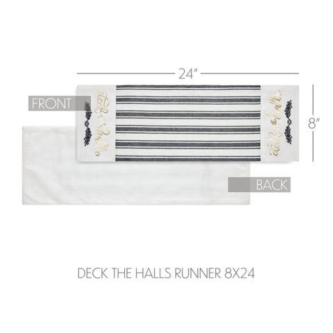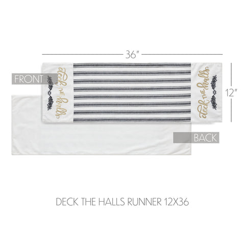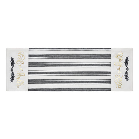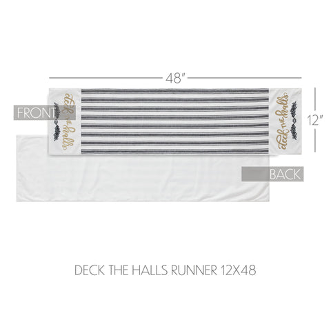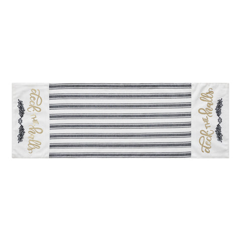 Craft a bold and festive table this season with an elegant black and white holiday table runner with gold foil accents. The Wintergleam Table Runner is made with 100 percent cotton. A simple grainsack stripe forms the center of the runner with accents on each end featuring a traditional holly berry print below gold foil lettering reading, Deck the Halls. Coordinates with the Wintergleam Collection for bold and elegant Christmas style for the entire home.