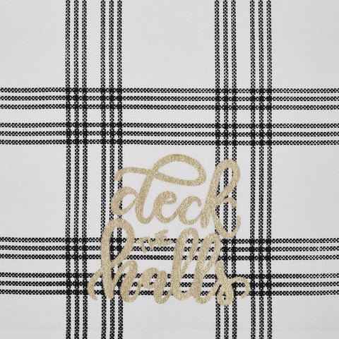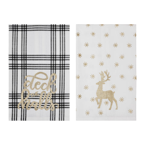- Black & White Designs — Two unique towels coordinate with a shared theme of traditional patterns in black, white and gold. The first towel features a simple black and white plaid with gold word art reading, deck the halls while the second towel sports a unique pattern accented with a bold gold foil reindeer.