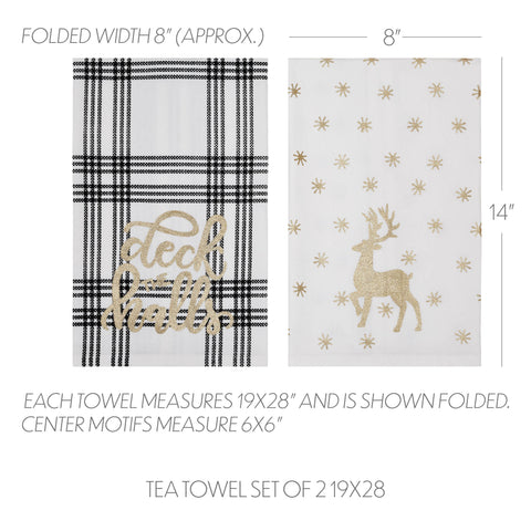 Liven up your kitchen and add Christmas cheer with bright country style tea towels. The Wintergleam Tea Towel Set includes two bleached cotton muslin kitchen towels measuring 19x28 inches. Each towel features a unique, printed design on a bright white base. One towel features a black and white plaid base with gold foil script Deck the Halls. The second towel features a prancing gold reindeer set against a backdrop of shimmering gold snowflakes.