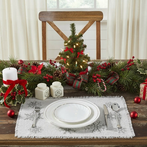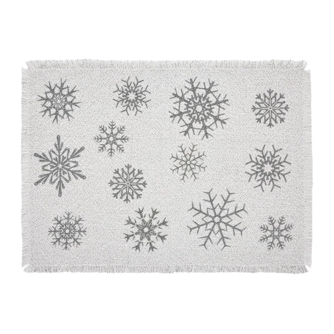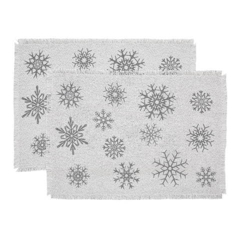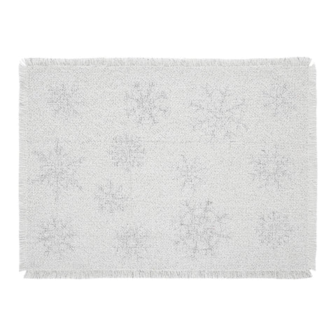 Create an elegant winter table setting with a soft white pattern with neutral gray and silver accents. The Yuletide Burlap Antique White Placemat Set includes two 13x19 inch placemats constructed with a single layer of cotton burlap fabric with metallic accents. The simple placemats feature a bold snowflake pattern in dove grey that brings the wonder of the season to your kitchen table. The antique white placemats have a lightly frayed edging for a textured, rustic look. Coordinates with the Yuletide Burlap Collection for kitchen and home accessories that add casual, neutral elegance to your holiday decor.